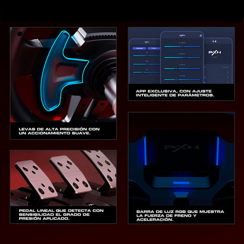 Las configuraciones se realizan a través de la aplicación PXN Wheel (disponible en Playstore) desde el teléfono móvil, sin necesidad de utilizar drivers.