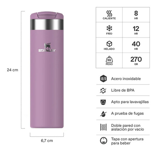Su diseño ergonómico y fácil de sujetar, junto con su mango giratorio, permiten un agarre rápido y listo para cualquier actividad. Ya sea que estés haciendo una caminata matutina o haciendo kayak en el lago, la Botella Térmica Stanley Flip Straw 600 ml es el complemento perfecto para mantenerte fresco e hidratado en todo momento.